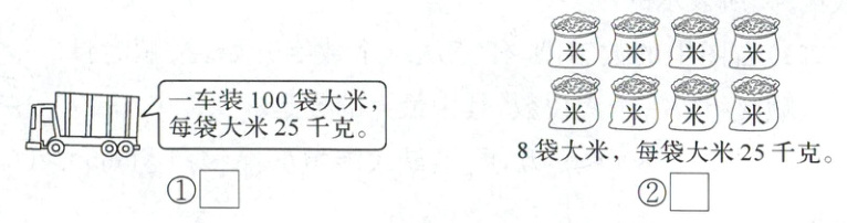 (2)①√ 6700万+3100万=9800万 9800万接近1亿,所以9800万粒米的质量接近2600千克,25×100=2500(千克),25×8=200(千克),所以选①。