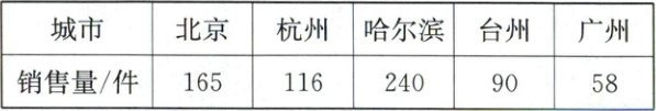 (1)根据表格数据,北京销量$165$件,杭州$116$件,台州$90$件,广州$58$件,纵轴每个间隔为$50$,从下往上依次填$50$、$100$、$150$、$200$,然后按照对应数据画出北京、杭州、台州、广州的条形
