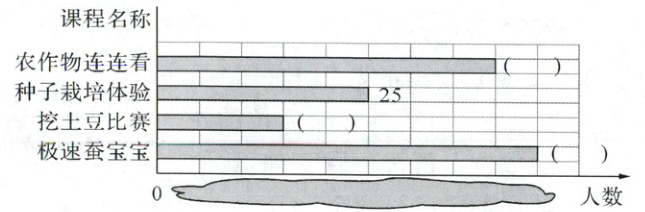 “挖土豆比赛”占$3$格,人数为$3×5 = 15$人;“农作物连连看”占$7$格,人数为$7×5 = 35$人;“极速蚕宝宝”占$8$格,人数为$8×5 = 40$人。
