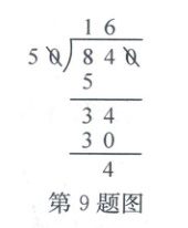 9. 新华书店新到 840 本书,每 50 本放一个书架。计算如图所示,可以放满()个书架,还剩()本。