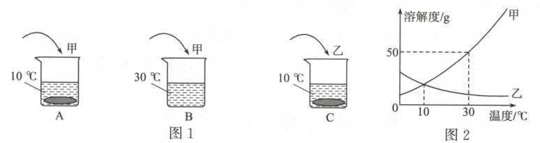 (1)图2是甲、乙两种物质的溶解度曲线图,按图分析,10℃时A烧杯和C烧杯中未溶解的溶质质量关系是