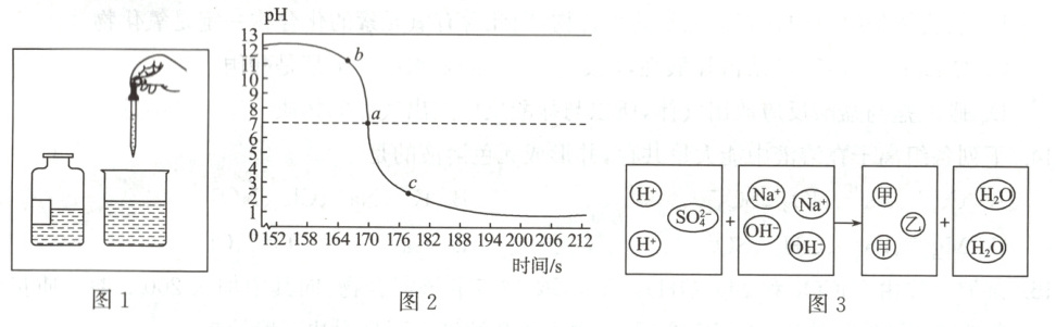 18. (12分)某化学兴趣小组三位同学在学习了硫酸与氢氧化钠反应后,分别结合自己在实验室中所做的实验,从不同方面对其进行图像描述。图1是实际操作图,图2是反应过程中溶液的酸碱度变化图,图3是微观粒子结合过程的示意图。