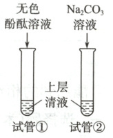 取少量用热水洗涤2~3次后的白色沉淀于试管中,加适量蒸馏水,振荡后静置。取上层清液,分别进行如图操作,观察到:试管①中溶液由无色变为红色,试管②中出现白色沉淀。