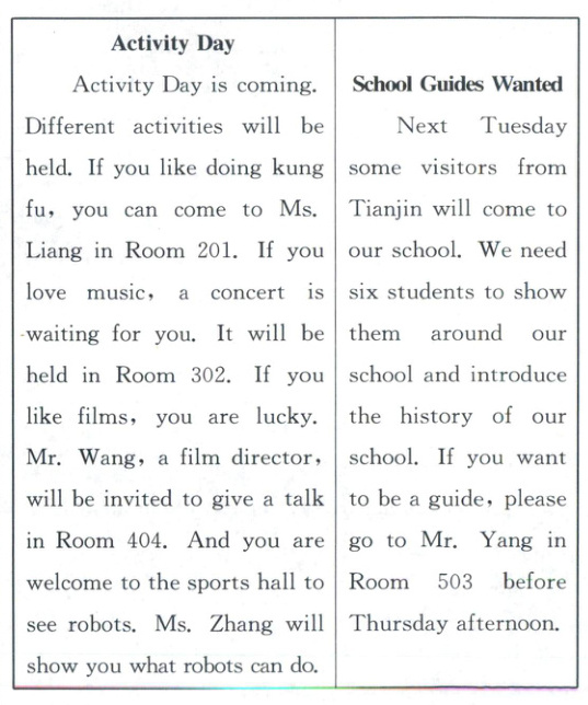 3.A 解析:细节理解题。根据“If you want to be a guide,please go to Mr. Yang in Room 503 before Thursday afternoon.”可知,如果你想成为导游,可以找杨老师。