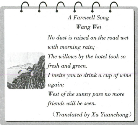 Friends are important in our lives,but we sometimes have to separate from our friends. “A Farewell(告别)Song” is about saying goodbye to a friend. It is a famous poem by Wang Wei,a great poet,who lived in the Tang Dynasty. He was good at writing poems and drawing. When talking about Wang Wei,people often say there are pictures in his poems and that there are poems in his pictures. His poems are full of beauty and imagination.