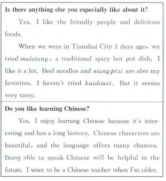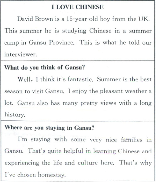 3.A解析:推理判断题。根据表格中What do you think of Gansu?Well,I think it's fantastic.可推知,戴维非常喜欢甘肃。