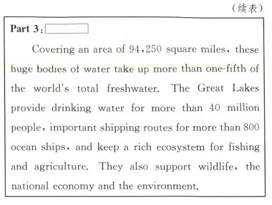 3.A 解析:推理判断题。根据方框下方内容可知,五大湖为4000多万人提供饮用水,为800多艘远洋船只提供重要的航运路线,并为渔业和农业保持了丰富的生态系统。它们还支持野生动物、国家经济和环境,这应是其“价值”。