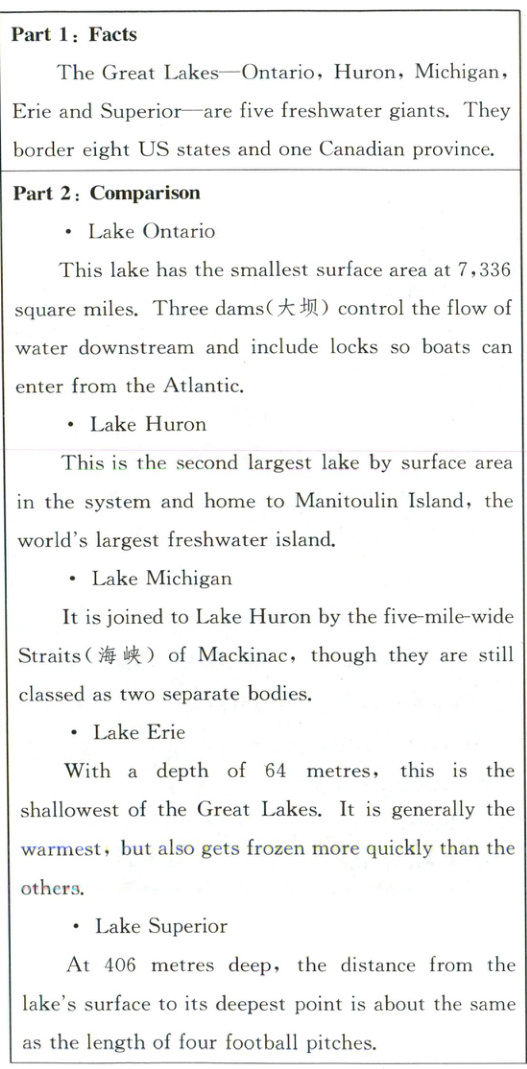 2.B 解析:细节理解题。根据“With a depth of 64 metres, this is the shallowest of the Great Lakes. It is generally the warmest, but also gets frozen more quickly than the others.”可知,Lake Erie结冰最早,适合最早尝试冰钓。