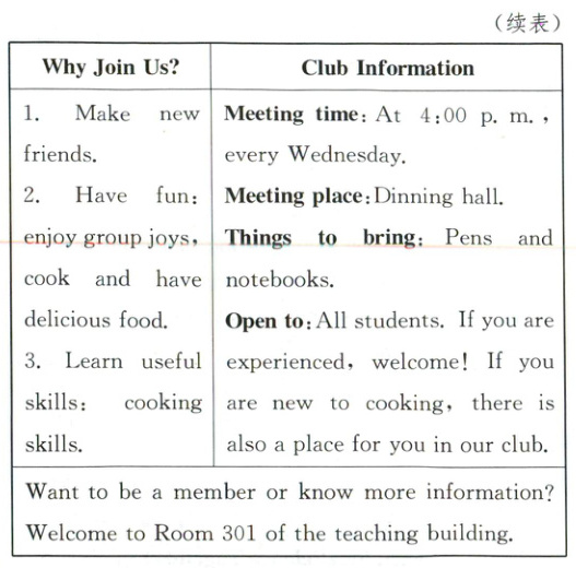 2.C 解析:细节理解题。根据“1. Make new friends. 2. Have fun:enjoy group joys, cook and have delicious food. 3. Learn useful skills:cooking skills.”可知,在俱乐部可以交朋友,吃美食,学习烹饪技巧。