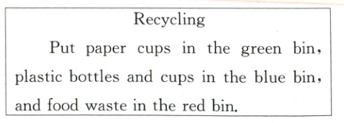 5. D 解析:根据“Put paper cups in the green bin, plastic bottles and cups in the blue bin, and food waste in the red bin.”可知,把纸杯放在绿色垃圾桶,塑料瓶和杯子放在蓝色垃圾桶,食物垃圾放在红色垃圾桶。