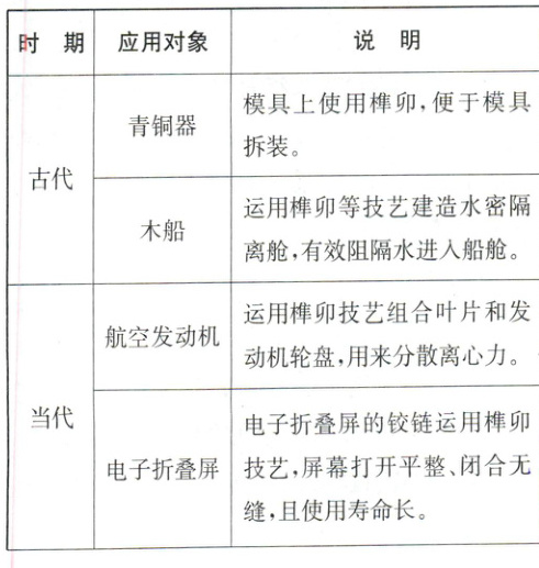 [材料一]榫卯(sǔn mǎo),是一种广泛应用在各类木制建筑、家具中起连接作用的构件,凸出部分为“榫”,凹进部分为“卯”。从新石器时代的河姆渡遗址到明清时期的故宫,榫卯结构贯穿了中国建筑的整个历史,蕴含着千年智慧。2009年,以榫卯结构为关键技术的中国传统木结构建筑营造技艺,被列入联合国人类非物质文化遗产名录。