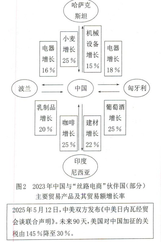 2. ① 2023年中国与“丝路电商”伙伴国(部分)进出口贸易额均呈增长趋势;② 出口贸易以电器和机械设备等工业制品为主;③ 进口贸易以乳制品和粮食等原材料为主。