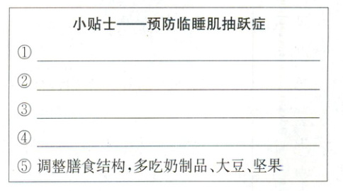 2. ①白天过于兴奋或剧烈运动;②摄入较多咖啡因或尼古丁等兴奋剂;③过度焦虑或者疲惫,大脑缺乏休息,控制睡眠和觉醒的两套系统容易失衡;④缺钙。