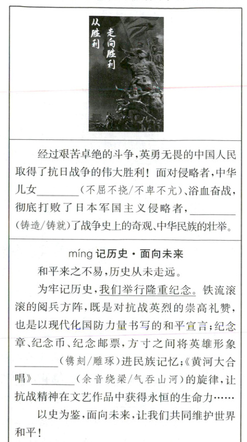 (1)D 解析:第一处:“不屈不挠”的意思是在压力和困难面前不屈服,表现十分顽强。根据语境可知,这里形容中华儿女在侵略者面前不屈服,顽强斗争,应选用“不屈不挠”。第二处:“铸就”的意思是通过某种方式创造、塑造、建设、形成某种具有特殊意义和价值的事物或人物。常常用于形容某些伟大的成就、功绩所带来的影响和贡献。根据语境可知,应选用“铸就”。第三处:“镌刻”的意思是把铭文刻在某种坚硬物质上。根据语境可知,应选用“镌刻”。第四处:“气吞山河”是形容气势或气魄极其宏大,仿佛能吞没高山和大河。根据语境可知,应选用“气吞山河”。故选:D。