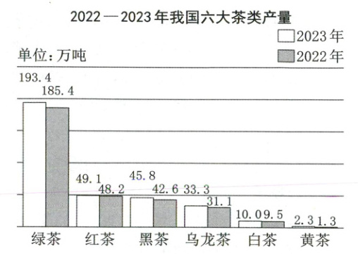 3.示例:①2022—2023年我国六大茶类中,绿茶产量远高于其他茶类。②从产量变化来看,2023年六大茶类产量较2022年都有所增长,但增长幅度相对较小。