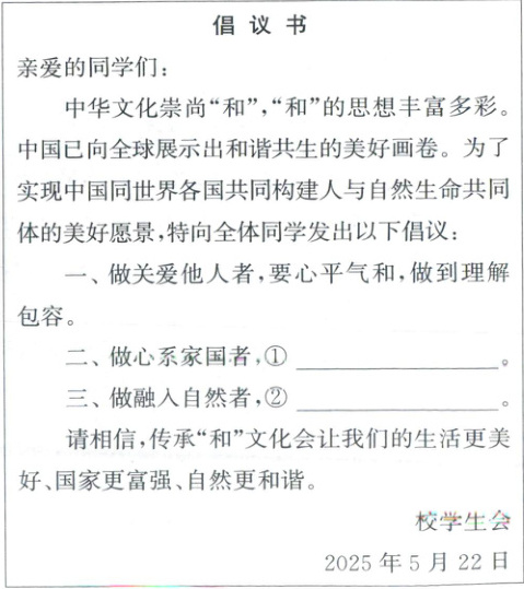 (3)[任务三:发倡议]围绕“和”文化,请你完善倡议书的内容。