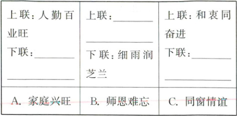 (2)[活动二:交流分享]活动中,同学们拟写了含“和”字的对联以寄托情感与祝福。请从 A、B、C 中任选两副,根据下方提示,补充上联或下联。