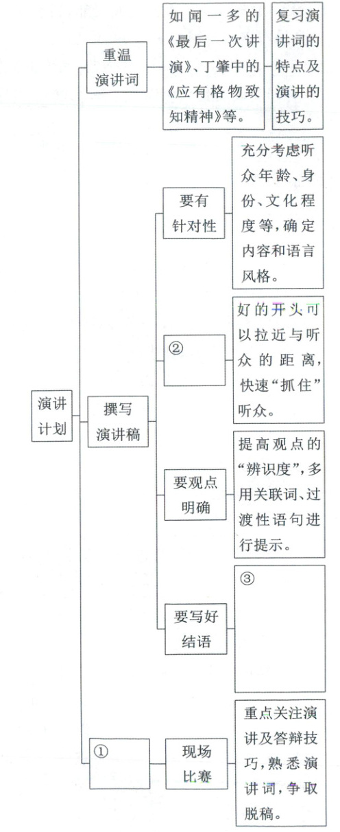(1)制订演讲比赛计划。请你根据图示将下面的演讲计划补充完整。