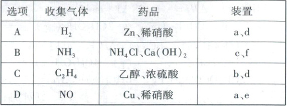 4.B 气体制备的药品及装置的选择 锌和稀硝酸反应生成一氧化氮,无法得到氢气,A错误;实验室通常采用氯化铵和氢氧化钙固体加热的方法制备氨气,由于氨气的密度比空气小,采用向下排空气法收集,B正确;乙醇和浓硫酸共热制备乙烯时,需控制温度在170℃左右,装置中缺少温度计,C错误;NO与空气密度接近,应用排水法收集,D错误。