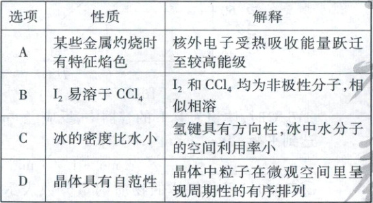 6.A 物质的结构与性质 某些金属灼烧时有特征焰色,这是核外电子从较高能量的激发态跃迁到较低能量的激发态乃至基态时,释放能量产生的现象,A错误;I₂和CCl₄均为非极性分子,根据相似相溶原理,I₂易溶于CCl₄,B正确;冰中的水分子形成了更多的氢键,由于氢键具有方向性,导致冰中水分子间隙更大,空间利用率变小,故冰的密度比水小,C正确;晶体的自范性是晶体中粒子在微观空间里呈现周期性的有序排列的宏观表象,D正确。