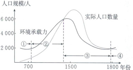 [厦门一中月考]复活节岛是一个孤悬于南太平洋中部的小岛,与最近陆地的直线距离超过 1 900 km。考古发现,在公元 600 年左右,该岛开始出现人类活动的痕迹。下图为复活节岛人口总量与环境承载力的关联变化关系图。读图,完成 9、10 题。