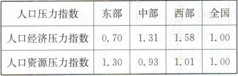 [临沂七中月考]人口压力指数分为人口经济压力指数和人口资源压力指数。一个地区的人口经济或人口资源压力指数是全国人均经济或资源指标除以该地区相应人均指标后所得的比值。读我国东部、中部和西部地区的人口经济压力指数和人口资源压力指数统计表(下表),完成下题。