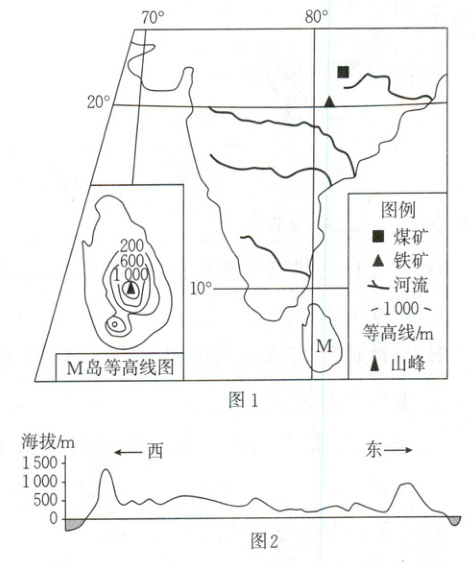 1.M岛位于北印度洋,南部由西南季风带来丰沛降水,淡水资源丰富;南部地势较高地区,气候凉爽,适宜人类居住;南部沿海平原,地势平坦,利于农业发展。