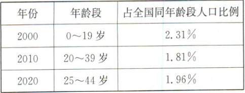 人口年龄结构对区域发展至关重要,其中20~39岁的黄金年龄劳动力最具经济活力。读我国某市2000-2020年不同年龄段人口占全国同年龄段人口比例统计表,完成2、3题。