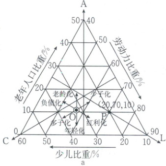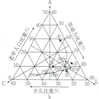 [2023·河北卷]人口年龄结构三角图适合刻画国家人口结构的演变路径。三角图中的点坐标记作$(C,L,A)$,$C$、$L$、$A$分别表示少儿、劳动力和老年人的人口比重,且$C+L+A=100\%$,如下图 a 点$P$所示。任意点$O$的运动方向含义如图 a 所示。图 b 描述了 1966—2020 年我国人口年龄结构演变路径。据此完成 1、2 题。