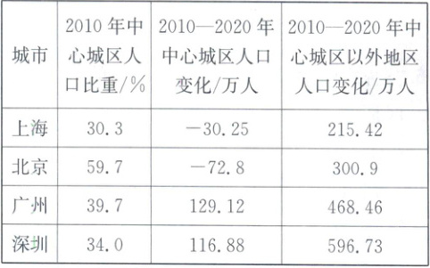 3.A 【解析】根据表中中心城区和中心城区以外地区人口数量的变化数据可知,2010—2020年,上海人口净增加184.17万人,北京人口净增加228.1万人,广州人口净增加597.58万人,深圳人口净增加713.61万人,所以四城市总人口都是净增加的。上海、北京中心城区人口数量减少,中心城区以外地区人口数量增加,故上海、北京中心城区人口比重减少;广州、深圳中心城区和中心城区以外地区人口数量虽然都增加,但中心城区以外地区人口增加量远大于中心城区人口增加量,故广州、深圳中心城区人口比重也在减少。故选A。