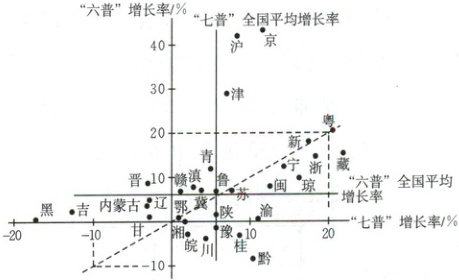 [2022·江苏卷]我国于 2010 年和 2020 年分别进行了第六次全国人口普查(“六普”)和第七次全国人口普查(“七普”)。下图为我国大陆 31 个省、自治区、直辖市“六普”“七普”人口增长差异图。据此完成 6~8 题。