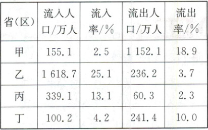 10.D 【解析】由表中数据可知,甲、丁流入率小于流出率,为人口净迁出区,应该为我国经济欠发达的中西部地区,但新疆人口稀少,石油资源丰富,由于资源的开发,人口为净迁入区,与表中丙对应,A、C错误;吉林地处东北地区,冬季气候寒冷,重工业基地衰退,人口迁出,D正确;乙地人口大量迁入,应为东部沿海地区,应为浙江省,B错误。