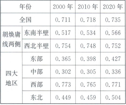 1.D 【解析】根据表中信息可知,我国四大地区的人口分布基尼系数均呈上升趋势,表明我国人口分布趋于集中,排除A;2010年到2020年,东北地区人口分布基尼系数增加,说明东北地区人口分布的集中程度增加,排除B;根据所学知识可知,胡焕庸线两侧东南半壁人口较为集中,排除C;2000年到2010年,东南半壁人口分布基尼系数增加,且东南地区人口数量较多,东南人口更加集中,D正确。故选D。