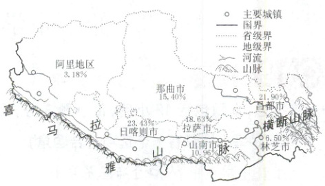 [淮南一中月考]西藏自治区下辖 6 个地级市、1 个地区。地势由西北向东南倾斜,地形复杂多样。下图为西藏各地市人口及主要城镇分布图(图中数值为各地市人口占全自治区总人口的百分比)。读图,完成 11、12 题。