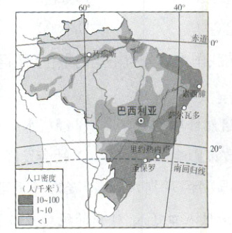 (2)巴西利亚位于巴西高原,为热带草原气候,海拔比较高,气候凉爽,适宜居住;(2分)马瑙斯位于赤道附近的亚马孙平原,为热带雨林气候,潮湿闷热,不适宜居住。(2分)
