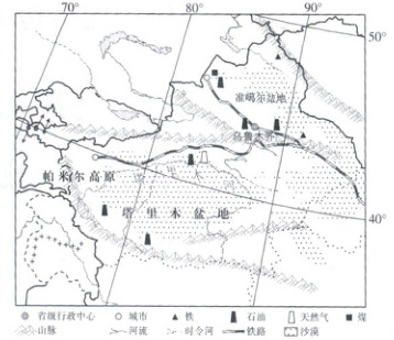 (1)读图可知,准噶尔盆地南部布局有铁路线,交通便利,对外开放程度高,因此其区域资源环境承载力较塔里木盆地南部更大。