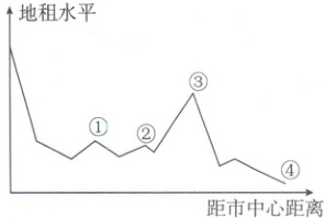 3.C【解析】土地利用类型取决于付出租金的多少,距离市中心的远近和交通通达度是影响地租高低的直接因素。一般来说,距离市中心越近,交通通达度越好,地租水平越高。图中③处出现了地租次高峰,虽然距离市中心较远,但是地租水平较高,说明交通通达度好。