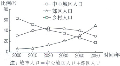 1.C 【解析】2020—2030年,该区域乡村人口比例并不为0,乡村人口并没有全部转移到郊区,A项错误;2050年,该区域乡村人口比例约为20%,B项错误;2040年,该区域郊区人口比例大于乡村人口比例,郊区人口超过乡村人口,C项正确;无法从图中判断该区域2000年和2050年城市中心人口的数量关系,D项错误。