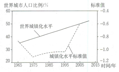 [银川二中月考]标准值是指一个国家某项数据与世界平均水平之差的标准化数值。下图为1965—2015年世界城镇化水平及某国城镇化水平演变过程图。读图,完成7、8题。