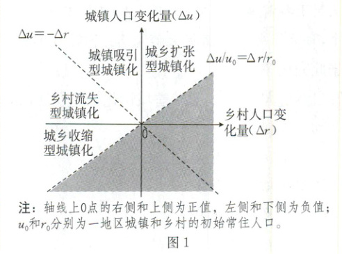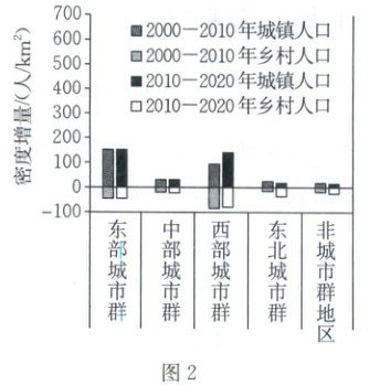 [山东省实验中学期末]城镇化是区域城镇和乡村人口变动共同作用的结果。某研究团队从城乡人口变动的视角划分城镇化地域类型(划分方法如图1所示),发现中国城镇化实现路径存在较强的时空动态性。图2示意2000—2020年中国城市群城乡人口变动统计。据此完成4~6题。