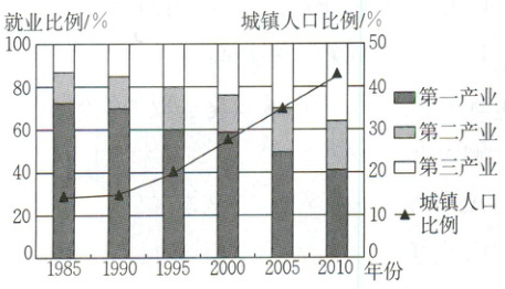 [德州一中期末]读某地区1985—2010年就业结构与城镇人口比例变化图(下图),完成2、3题。