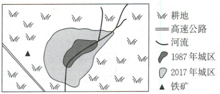[商洛检测]读我国中部某中等城市1987年和2017年城区面积变化图(下图),完成下题。