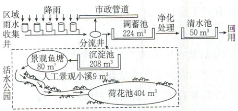 [湖南师范大学附中月考]城市建设中出现了城市内涝、生态破坏、径流污染等诸多问题,因此应积极推进能“自然积存、自然渗透、自然净化”的海绵城市试点建设工作,其中活水公园雨水收集系统是海绵城市建设的成功案例。读某活水公园雨水收集系统示意图(下图),完成 7~9 题。