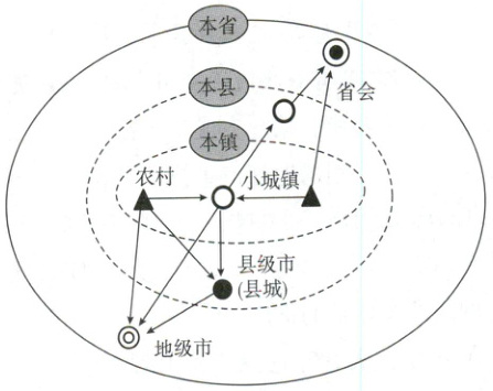 [长沙一中期中]就近城镇化是指农村人口近距离迁移到户籍所在地附近的中小城镇就业和居住,实现农民非农化、生活城镇化和身份市民化的过程,其农村劳动力转移主要来自本镇、县内及省内。2000年以来,我国中西部地区就近城镇化发展迅速。下图示意中西部地区就近城镇化过程。据此完成1、2题。