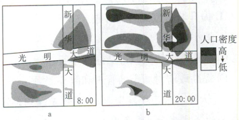 [九江一中期中]人口热力图是根据测得的热力值,用不同颜色的区块叠加在地图上进行实时描述人群分布、密度的统计图。图a、图b分别为我国某城市8:00和20:00的人口热力图。据此完成5、6题。