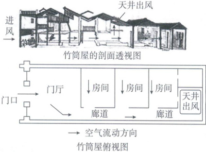 4.A【解析】结合材料以及图示信息可知,竹筒屋开间小,进深大,不设窗户,只有一个人门进出,通过一条廊道与各房间连接,因此其安全防卫功能好,房屋进出较为不便,①正确,②错误;由于不设窗户,只留天井出风,因此室内采光条件并不优越,④错误;廊道较为狭窄,空气经过廊道处流动速度加快,使得气压降低,从而有利于各房间内的空气流出进入廊道,实现空气的更新与热量交换,通风散热效果好,③正确。故选A。