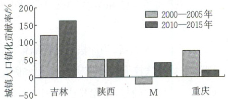 [青岛模拟]人口城镇化分为“城化”和“镇化”两部分。人口“城化”是指人口向各类城市的城区集中的自然历史过程,而人口“镇化”是指人口向小城镇的镇区集中的自然历史过程。为测定镇区人口集聚程度及其对人口城镇化发展的贡献,将镇区总人口占城镇总人口的比例称为“城镇人口镇化水平”,将某一时期内某区域的镇区人员增长量占城镇总人口增长量的比例称为“城镇人口镇化贡献率”。下图示意我国部分省(市)2000—2005 年和 2010—2015 年两个时段的城镇人口镇化贡献率柱状分布。读图,完成 1、2 题。