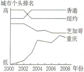 3.D 【解析】该图显示的是城市个头排名的变化,芝加哥排名下降,说明被其他城市的城市个头超过,而不是芝加哥的楼高降低,A项错误;城市个头与城市楼房高度有关,与城市面积无关,B项错误;香港土地成本提高,导致高楼数量增加,城市个头排名上升,C项错误;重庆为山城,建设用地紧张,因此城市发展过程中高楼建设较多,D项正确。