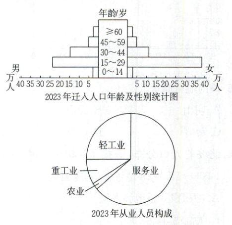 5.D 【解析】读迁人人口年龄及性别统计图,不能判断该市外来人口大于本地人口,A项错误;根据产业结构分析,轻工业、服务业所占比例很大,人口迁移主要受经济因素的影响,B项错误;迁入人口中女性比例大,所以可能对该市造成婚姻、生育等社会问题,C项错误;该市产业结构以轻工业和服务业为主,需要女性劳动力的数量多于男性劳动力,故迁入人口中女性数量多于男性可能与该市产业结构有关,D项正确。