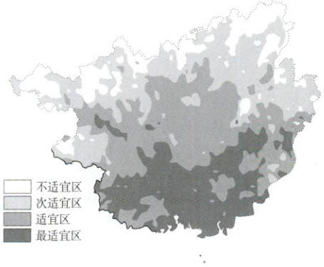 3.A 【解析】图中广西甘蔗气候区基本从南向北依次为最适宜区、适宜区、次适宜区、不适宜区,由南向北有规律地递变,与气温的变化规律相似,与水分、光照、风力分布相关性不强,因此影响广西甘蔗气候区划的主要因素是热量。故选A。